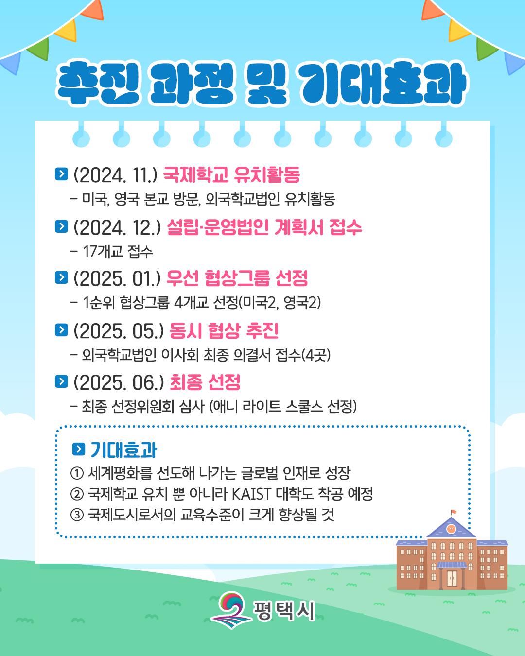 평택국제학교 최종 선정 학교 발표! 페이지 정보 작성자 관리자 댓글 0건 조회 107회 작성일 25-10-14 11:06 본문 그동안 많은 관심과 기대를 모았던 국제학교 유치 사업,이번 발표로 평택의 교육 인프라에 큰 변화가 기대됩니다. 목록 이전글 청주공항버스 개통 다음글 평택시, 지난 10년간 전국 시군 중 ‘가장 발전한 도시’ 댓글목록 댓글목록 등록된 댓글이 없습니다.